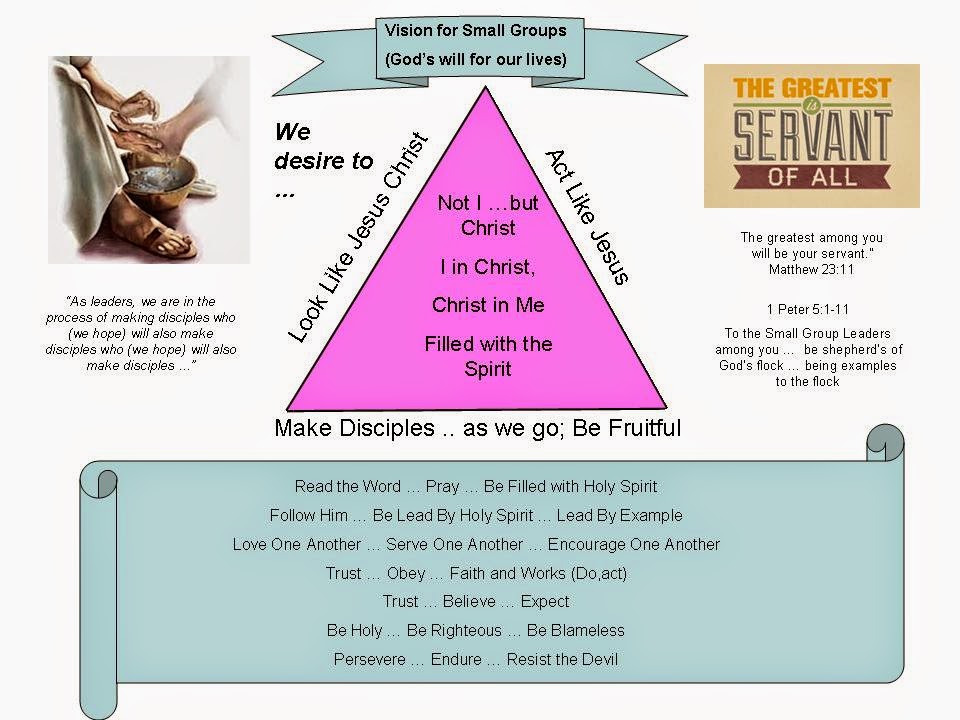 1. I shared my vision for small groups which can also be your own personal vision. It is aligned with the great commission that Jesus has given to us - to make disciples and be fruitful. We can do that by recognizing that we must reckon our selves dead to self and alive in Christ (Galatians 2:20) and continually be filled with and lead by the Holy Spirit as we seek to expand His kingdom. We desire to look like Jesus, act like Jesus and lead like Jesus. I pointed out several spiritual disciplines (our part in the sanctification process) that we need to be incorporating into our lives to help us become more like Jesus ... see banner below the triangle. There is also a partial list of scripture references that support this vision.